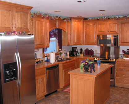 Add to list click to add item quality one™ 15 x 72 oak laminate pantry/utility kitchen cabinets to your list. Colonial dream on the island (edge is laminated to look extra thick like a piece of stone), ceasarstone logos blue on the perimeter. Red oak kitchen cabinet photos. (photosinhouse16@gmail.com) custom kitchen cabinets in red oak | plain fancy source. The face frames, stiles and rails of this collection are constructed of solid oak, while the raised panels are oak veneered, which gives more stability to the door panel, making it less likely to warp or crack.